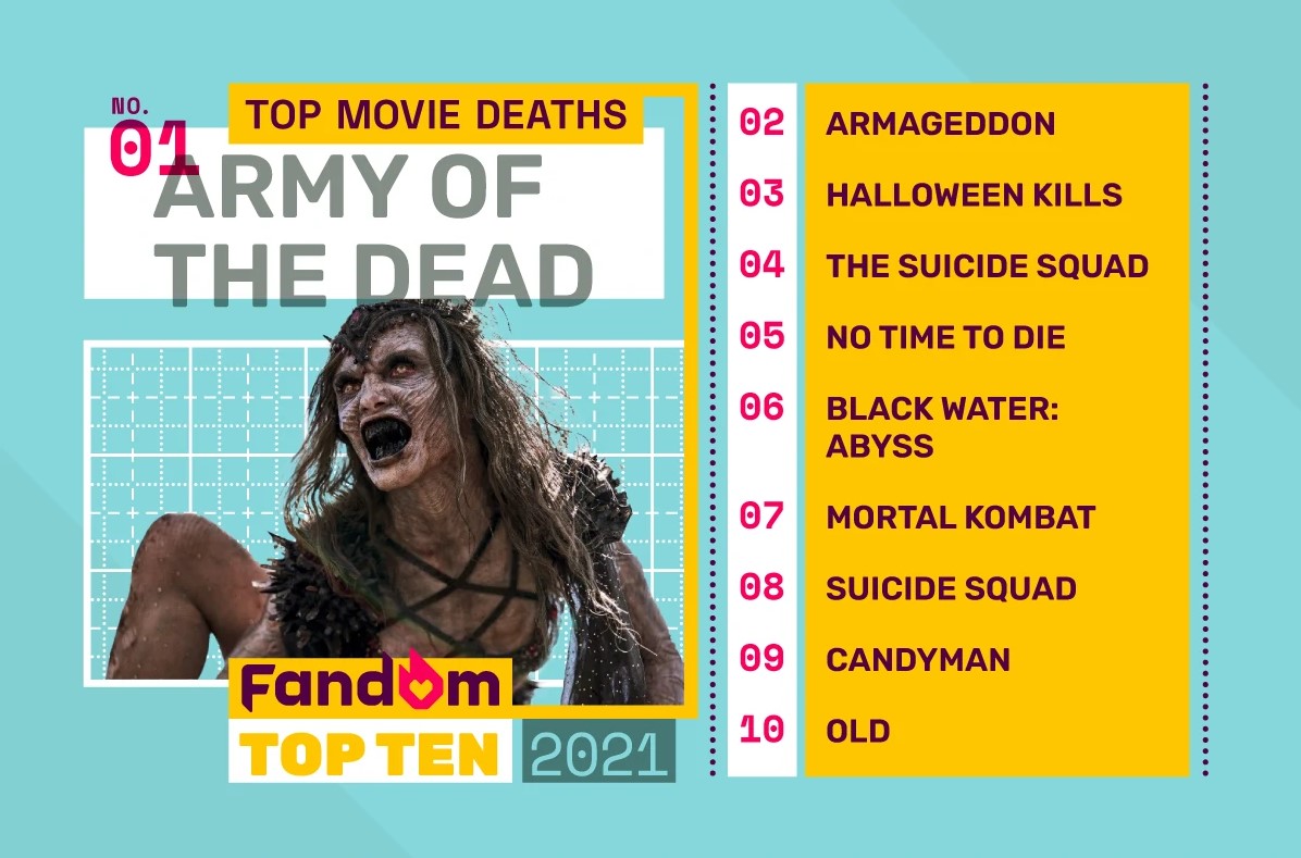 O site Fandom fez sua lista de 2021, com os filmes que tiveram as cenas de mortes mais icônicas. Army of the Dead: Invasão em Las Vegas, o filme de zumbi original da Netflix e que marca a parceria de Zack Snyder com o Streaming, ficou em primeiro lugar.