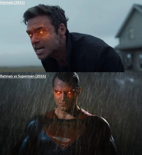Nesse sentido, a semelhança mais próxima que foram apontadas entre a próxima produção da Marvel e o estilo visual usado por Zack Snyder, em seus filmes de super-heróis, foi a forma como as veias do rosto se iluminam quando os personagens lançam raios de seus olhos. Não há muitos super-heróis da Marvel com esta capacidade, mas temos notado que Ikaris, o líder de Eternos, possui tal poder a, que, quando ativado, ele se assemelha visão de calor do Superman.