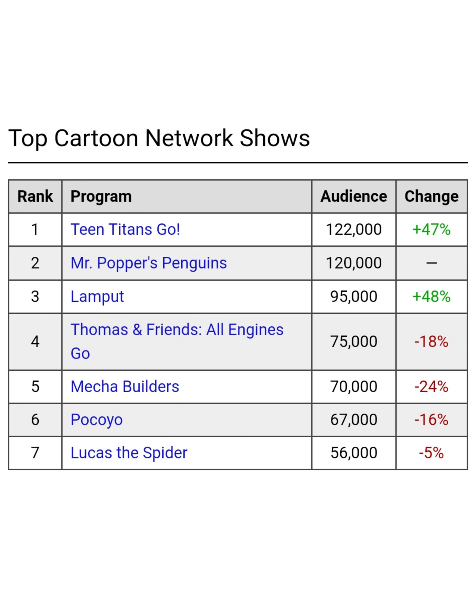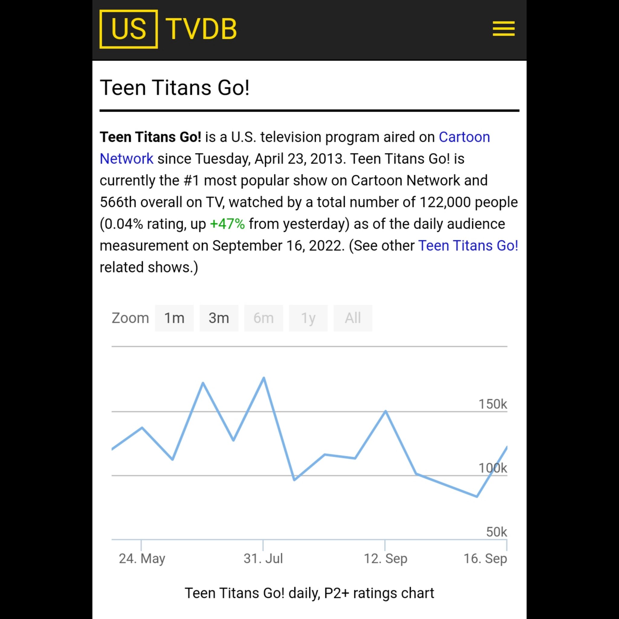 De acordo com o US-TVDB, a série animada Os Jovens Titãs em Ação! (Teen Titans Go!) é, atualmente, o programa número 1 mais popular da Cartoon Network.